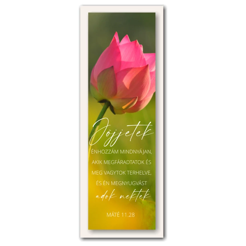 Fényes (laminált) karton, amelyen gyönyörű képek – virágok + ige látható. Ajándék bármely alkalomra. Bátorít és egyben segít. A köszönet, szeretet vagy a hála kifejezésére kiváló kedves kis figyelmesség. Remek ajándék gyermekeknek vagy keresztény táborok, iskolák egységes, ajándékcsomagok összeállításához. (méret: 5 x 15cm)